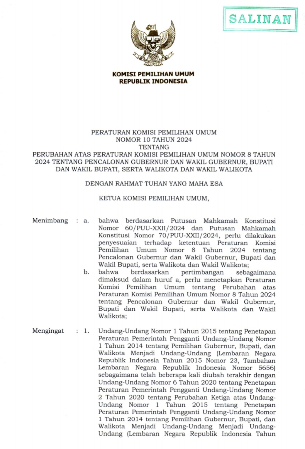 Menindaklanjuti dua Putusan MK tersebut, Komisi Pemilihan Umum Republik Indonesia (KPU RI) tertanggal 25 Agustus 2024 mengeluarkan Peraturan Nomor 10 Tahun 2024 tentang Perubahan Atas Peraturan KPU Nomor 8 Tahun 2024 tentang Pencalonan Gubernur dan Wakil Gubernur, Bupati dan Wakil Bupati, serta Walikota dan Wakil Walikota.